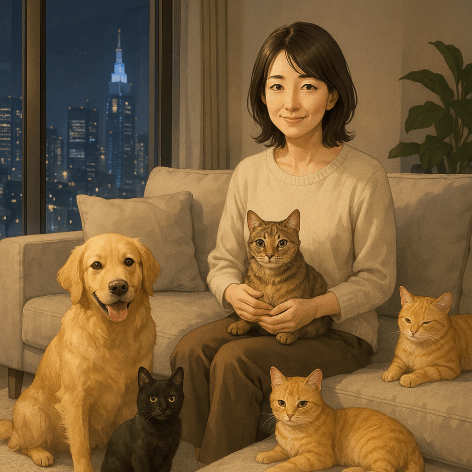 彼女を出迎えるのは、4匹の猫と1匹の犬。